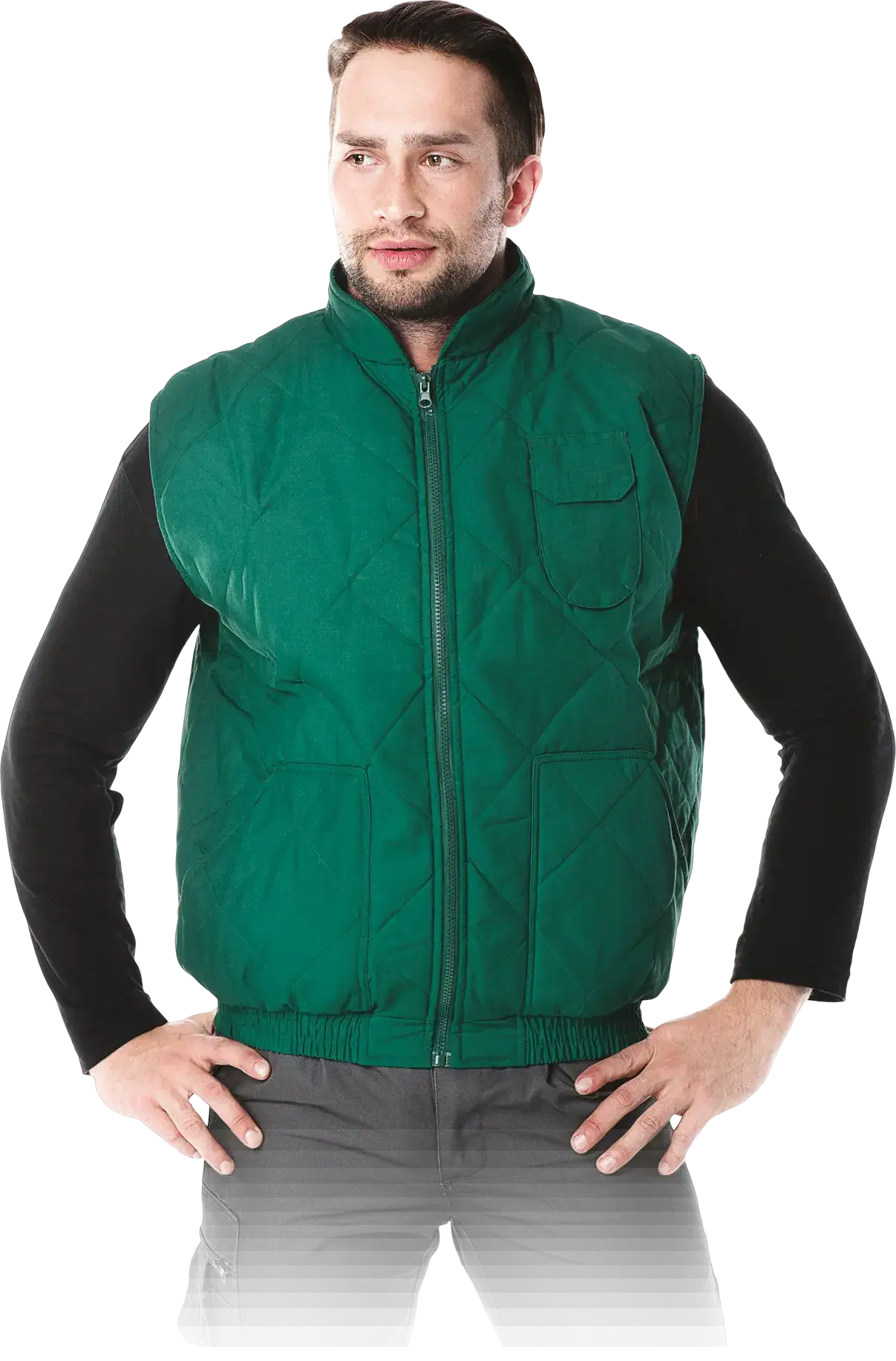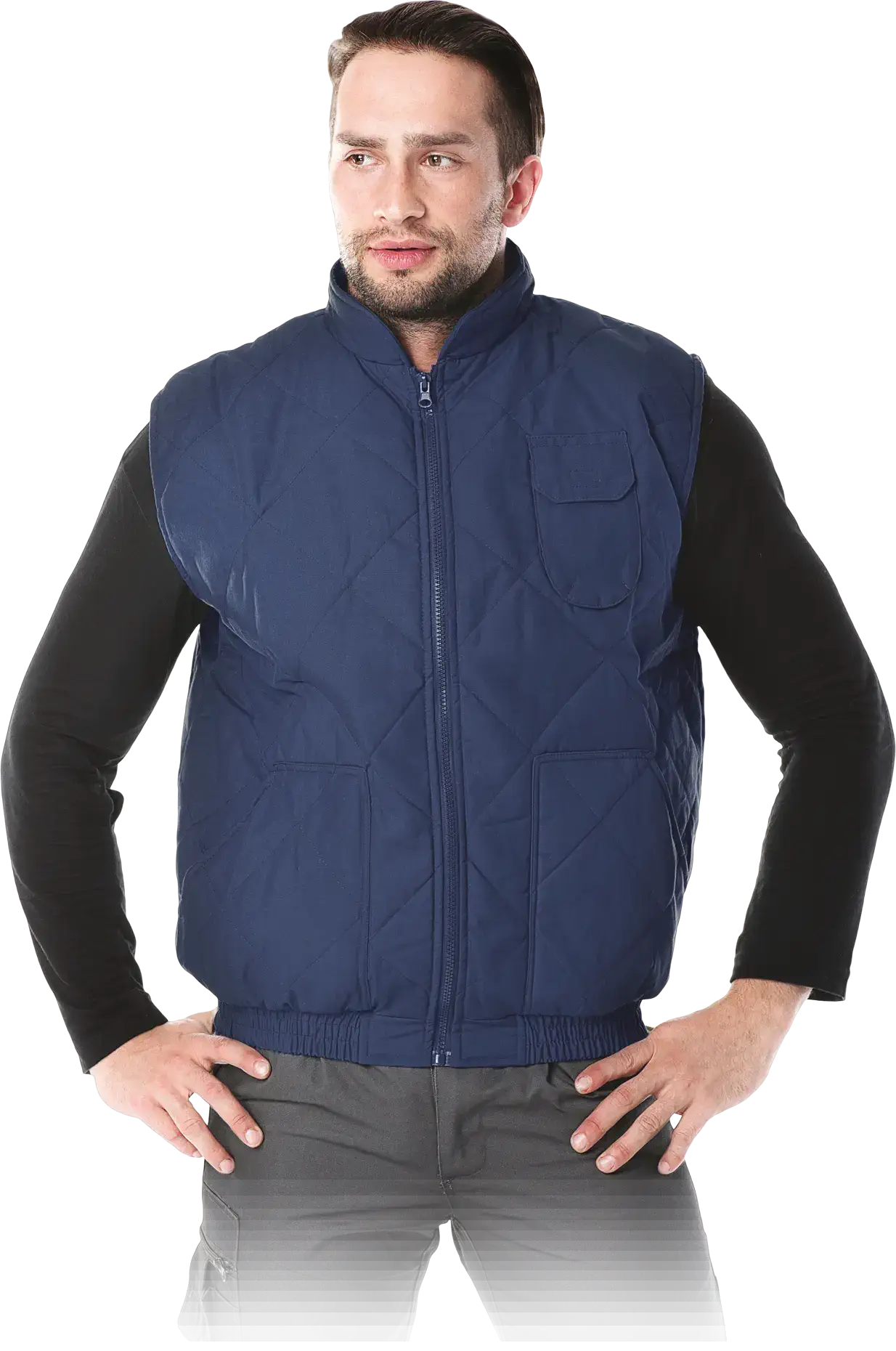 Чоловіча стьобана утеплена куртка без рукавів. тканина: 65% поліестер, 35% бавовна, щільність 150 г/м². підкладка 100% поліестер щільністю 160-180 г/м². підкладка 100% поліестер, щільність 60 г/м². застібається на блискавку комір-стійка дві кишені внизу і одна на грудях для мобільного телефону низ безрукавки оброблений манжетою.