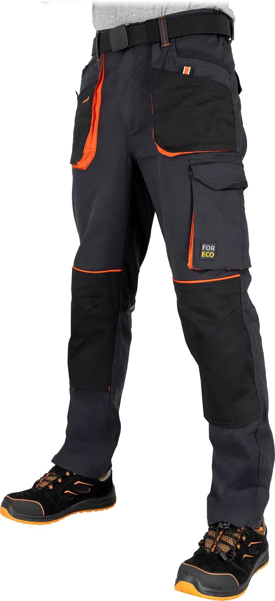 Захисні чоловічі брюки до пояса Функціональні та зручні захисні брюки, створені для інтенсивної роботи в різних умовах. Поєднання міцних матеріалів, продуманого крою та практичних деталей забезпечує комфорт, довговічність і безпеку протягом усього робочого дня. Матеріали: Основна тканина: холст — 64% поліестер, 34% бавовна, 2% еластан, щільність 240 г/м² Чорні вставки: холст — 64% поліестер, 34% бавовна, 2% еластан, щільність 240 г/м² Помаранчеві вставки в кишенях: твіл — 65% поліестер, 35% бавовна, щільність 200 г/м² Особливості та переваги: застібка на ґудзик і блискавку два бокові кишені з відділеннями та дві задні кишені на липучках кишені на штанинах: одна з липучкою та внутрішніми відділеннями, а також одна поздовжня кишеня нижні кишені для вставних наколінників анатомічно сформовані (контуровані) коліна для свободи рухів еластичний пояс у бокових частинах для кращої посадки світловідбивні елементи для підвищеної видимості та безпеки Ці брюки ідеально підходять для будівельних, монтажних, виробничих та інших робіт, де важливі надійність, комфорт і захист.